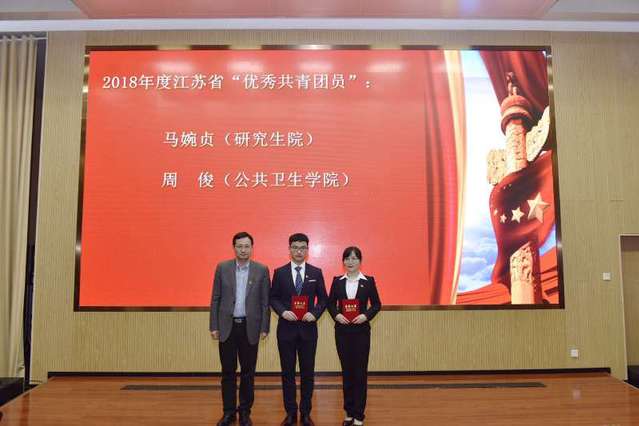 过去的一年,在共青团工作中我校涌现出一批优秀个人和集体,获得了多项省级荣誉。其中,研究生院马婉贞同学和公共卫生学院周俊同学获“2018年度江苏省优秀共青团员”称号,护理学院李现文老师获“2018年度江苏省‘十佳’青年志愿者”称号,药学院王金玉同学获“2018年度江苏省优秀青年志愿者”称号。