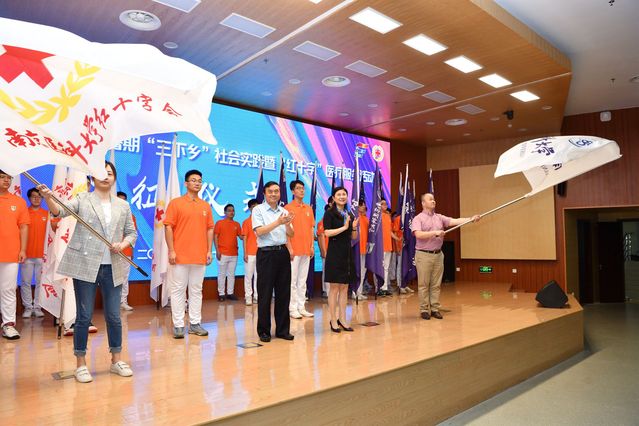 随后,副校长李建清、徐珊为校社会实践暨“红十字”医疗服务活动总队授旗,与会领导为各学院社会实践团队授旗。