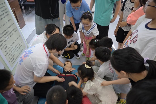 “姐姐,可以再讲一遍按的时候手应该放哪里吗?”在心肺复苏技能教学环节,孩子们围作一圈,认真倾听,全情投入这堂“健康第一课”。