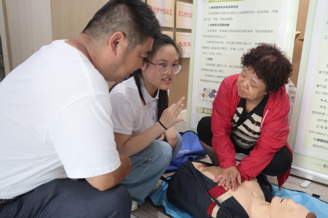 “手臂要伸直!”“按压深度5-6厘米!”在现场,成员们为居民们进行了心肺复苏技能和海姆立克急救法培训,详细讲解操作流程,进一步提升公众急救意识和急救技能。