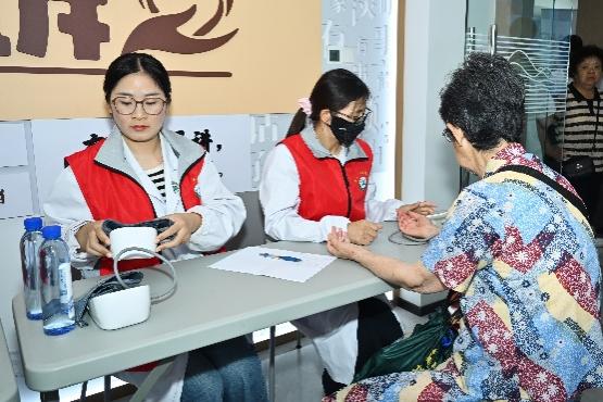 在义诊区,成员们为居民测量血压血糖,并邀请校友专家坐诊,为居民提供近距离、专业化的医疗服务。“作为医学生,参加科普义诊不仅可以促进居民健康,更能让我们巩固所学知识、理解医学意义,这是一场健康的双向奔赴”实践团成员张鸣寰说。