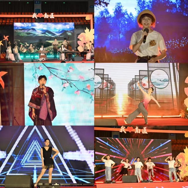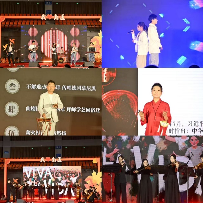 晚会分为“相遇·此刻正好”“聆听·岁月回响”“同行·奔赴未来”三个篇章,特邀国家级非物质文化遗产-苏北大鼓传承人倪雷、徐州香包代表性传承人孙歌尧带来《以传承续薪火 以创新添活力》的精彩演出。校园十佳歌手、校大学生艺术团、医科石榴籽团队以及承训部队教官等先后登台,通过声乐、器乐、舞蹈、朗诵、军事训练科目演示等多种形式,生动展现了我校师生爱国荣校、爱军拥军的深厚情怀和奋发向上、斗志昂扬的精神风貌。最后,在国庆节即将到来之际,全体演员合唱《我爱你中国》,将整个晚会推向高潮。