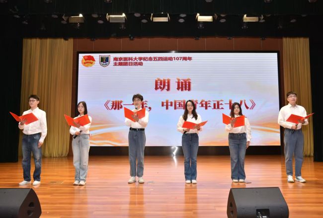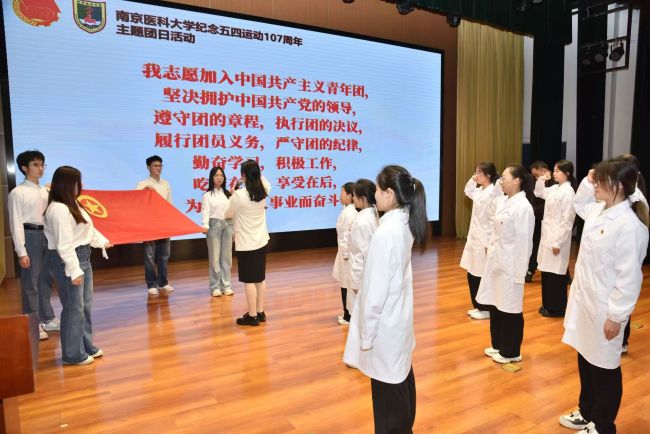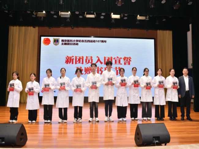 活动现场还举行了新团员入团宣誓和赠书仪式。校医馨朗诵团的同学与药学院师生代表带来诗朗诵《那一年,中国青年正十八》。