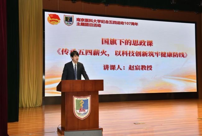 本次活动在庄严肃穆的国歌声中拉开序幕。2026年度“新时代青年先锋奖”获得者、药学院赵宸教授以《传承五四薪火,以科技创新筑牢健康防线》为题讲授了国旗下的思政课,他结合自身在海外求学、归国任教以及从事新药研发方面的经历,勉励南医青年以科技创新破题,以医药自强报国,努力撑起中国医药事业发展的“大梁”。